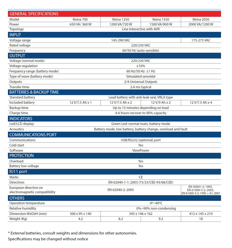 The Reina 700/1250/1550/2050 UPS combines design, versatility and easy handling with possibility to configure the device with different kind of schedule depending on customer needs. Reina includes USB communication port. With line interactive technology, Reina is able to protect against over voltage, to stabilize micro cuts and to back up against voltage drops. This technology allows optimization UPS